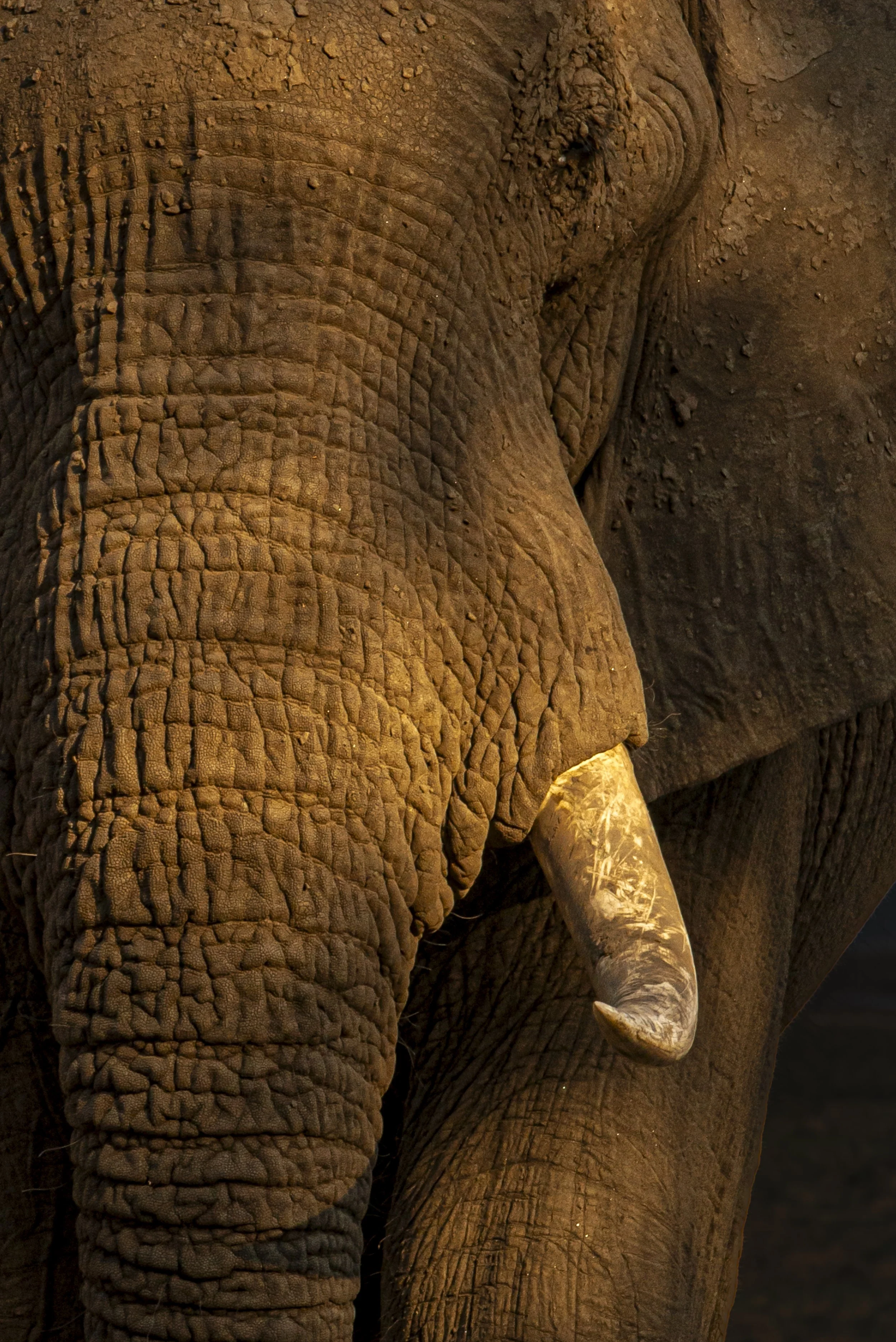 Whilst watching this big bull elephant feasting on the Winterthorn tree by rigorously pushing himself up against the trunk to make the fruits fall to the ground, he then turned around and the beautiful evening light shone onto his trunk and illuminated his magnificent tusk.